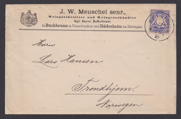 Drei Belege aus einer Korrespondenz an einen Weinhändler in Trondheim/Norwegen: Einzelfrankatur 5 Pfg. lila auf Drucksache 1885, Postkarte 10 Pfg. 1883, sowie Brief 20 Pfg.(hübscher Vordruck) aus Bischofsgrün 1895