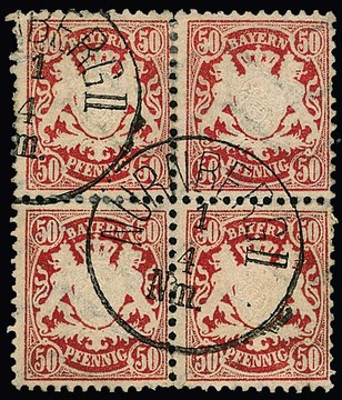 50 Pfg. zinnoberrot, seltener gestempelter Viererblock (K1 "Nürnberg II") mit kleinen gebrauchsbedingten Mängeln. Mi. 650,-
