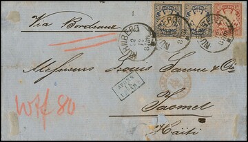 50 Pfg. zinnoberrot nebst zweimal 20 Pfg. ultramarin auf Faltbrief mit klaren K1 "Nürnberg" 1876 nach Jacmel/Haiti. Oben Leitvermerk "via Bordeaux" und links unten mit rotem Weiterfrankovermerk in Höhe von 80 Pfg. Obwohl etwas fehlerhaft, handelt es sich bei diesem Brief um eine auch in der Pfennigzeit seltene Vor-UPU-Destination