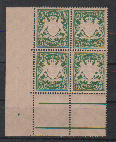 5 Pfg., gutes mattrosa x-Papier, im postfrischen Eckrand-Viererblock aus der Stegecke, Mi. 220,- ++