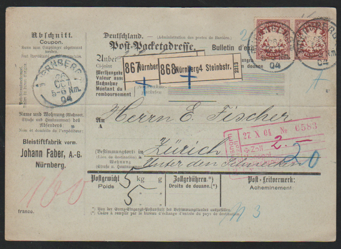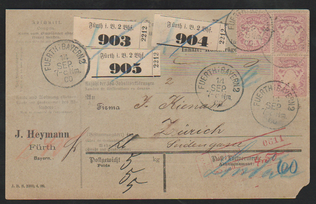 Zwei Auslandspaketkarten (einmal Formular etwas "eckrund") 1900/1904 in die Schweiz mit hohen Frankaturen, 30(2) und Paar 50 Pfg., bzw. dreimal 80 Pfg.