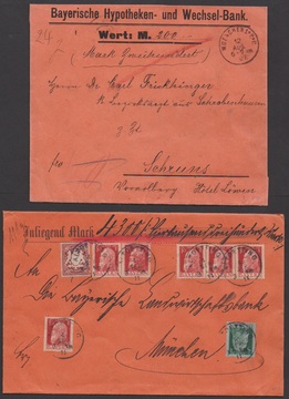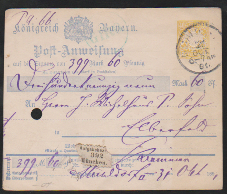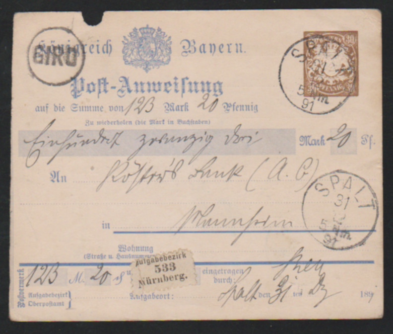 Zwei Postanweisungs-Ganzsachen gebraucht 1891, 30 Pfg. braun aus Spalt, sowie 40 Pfg. gelb aus Mühldorf
