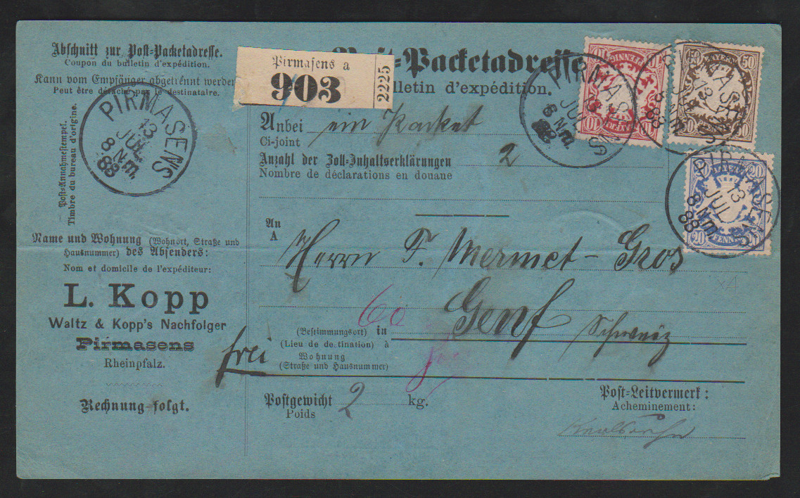 50 Pfg., gute A-Zähnung, nebst 10 u. 20 Pfg., auf Auslands-Paketkarte (leichte Gebrauchsspuren wie Mittelfalte) von Pirmasens 1888 nach Genf, sign. Helbig