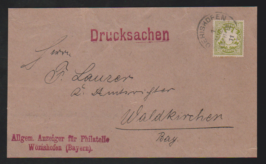 30 Pfg. oliv einzeln auf Drucksachen-Adresse der 6. Gewichtsstufe 1911 aus Bad Woerishofen