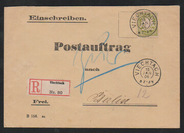 30 Pfg. einzeln auf eingeschriebenem Postauftrag von Viechtach 1906 nach Berlin und dort beim Postamt C2 amtlich eröffnet mit rs. entsprechender Eröffnungs-Vignette