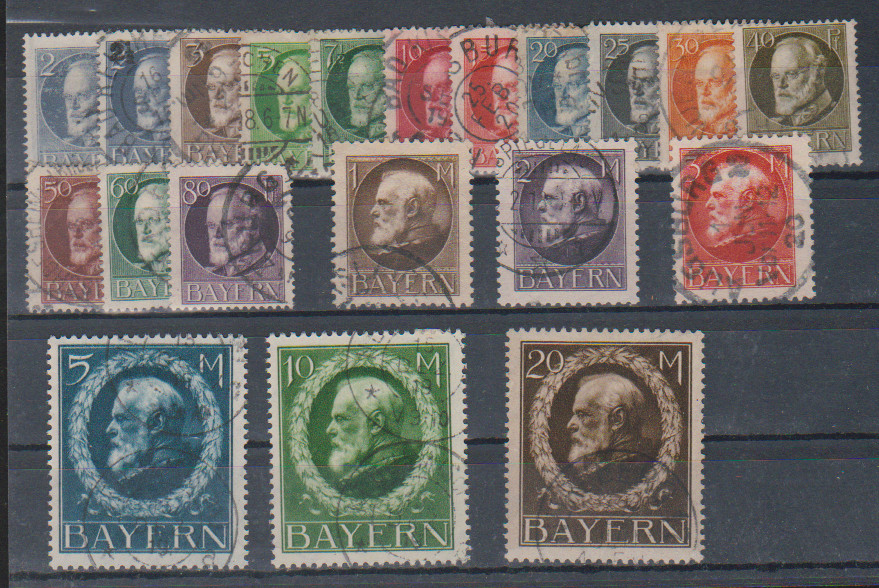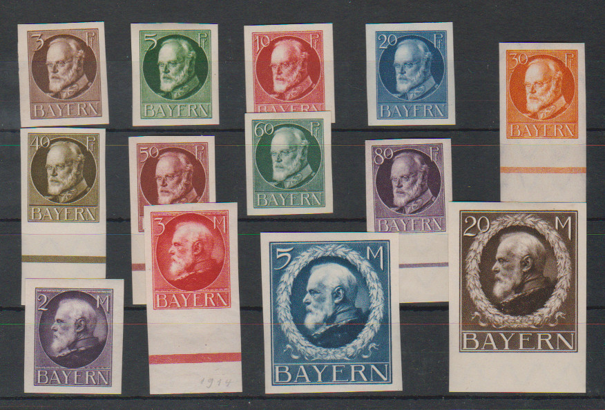 1 bis 20 Mk. Luitpold je als geschnittene Probedrucke auf Kanzleipapier, Höchstwert sign. Helbig