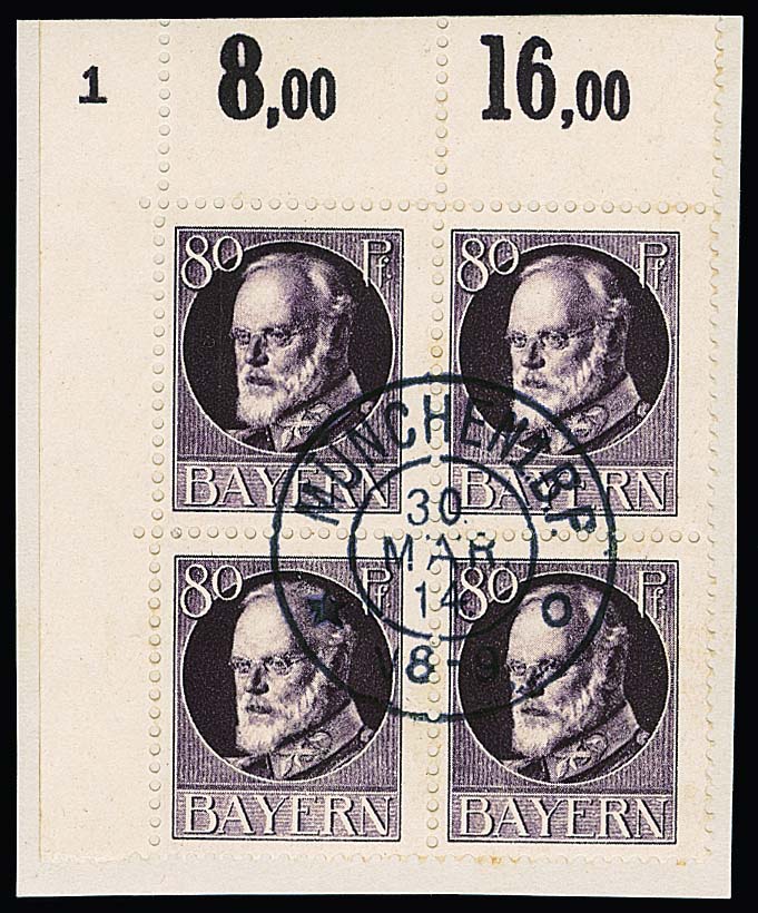 3 bis 80 Pfg. Ludwig Friedensdruck einheitlich in Viererblöcken aus der linken oberen Bogenecke mit Pl.-Nr. "1" (!) und zentrischem Münchener Ersttagsstempel