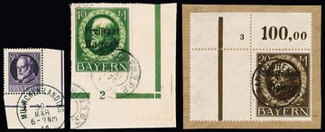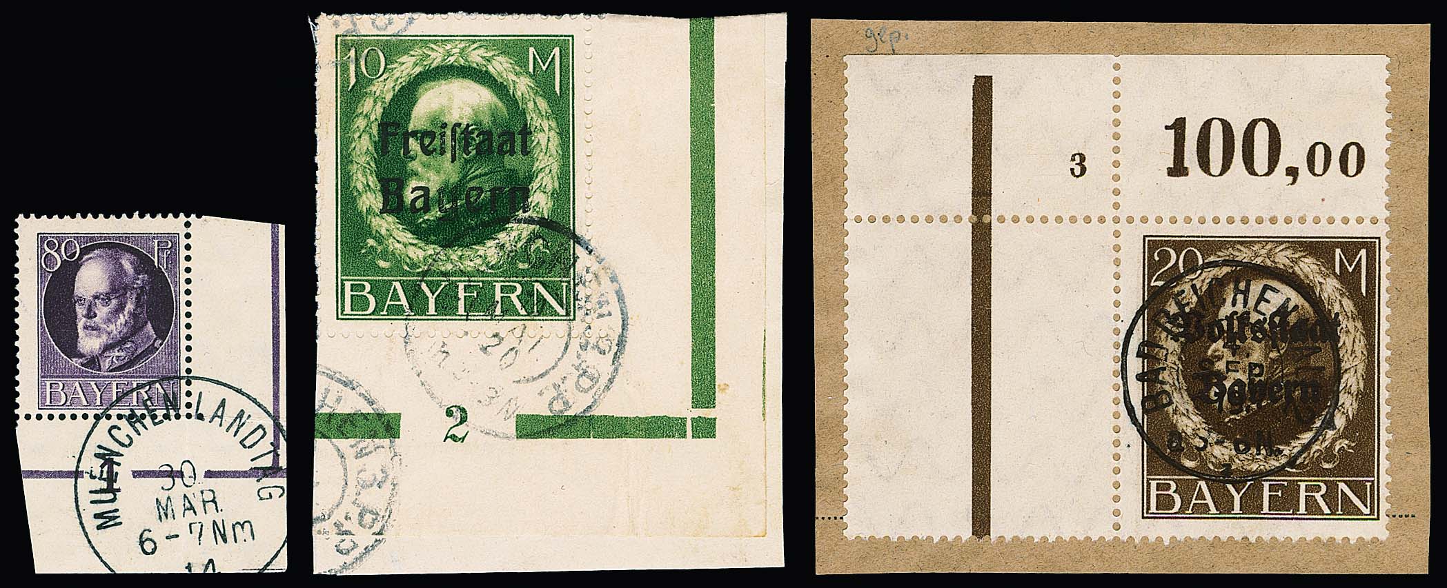 Ludwig inkl. Aufdrucken, 21 gestempelte Bogenecken, davon 18 mit Plattennummern, teils Befunde Helbig, auch u.a. 80 Pfg. Friedensdruck, dreimal 20 Mk. usw.