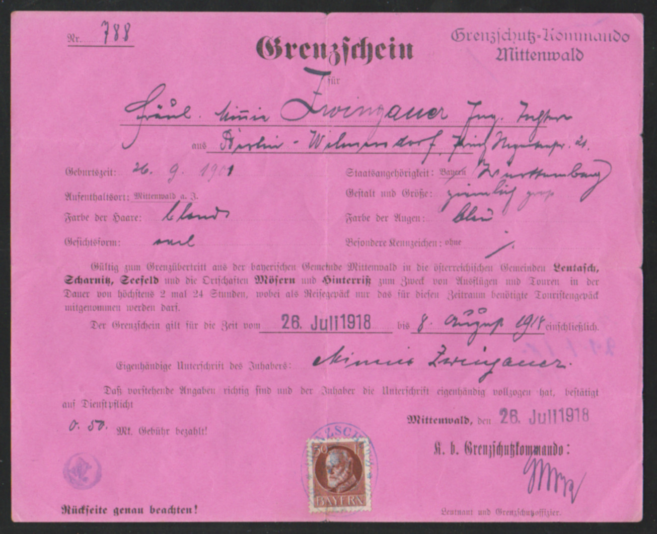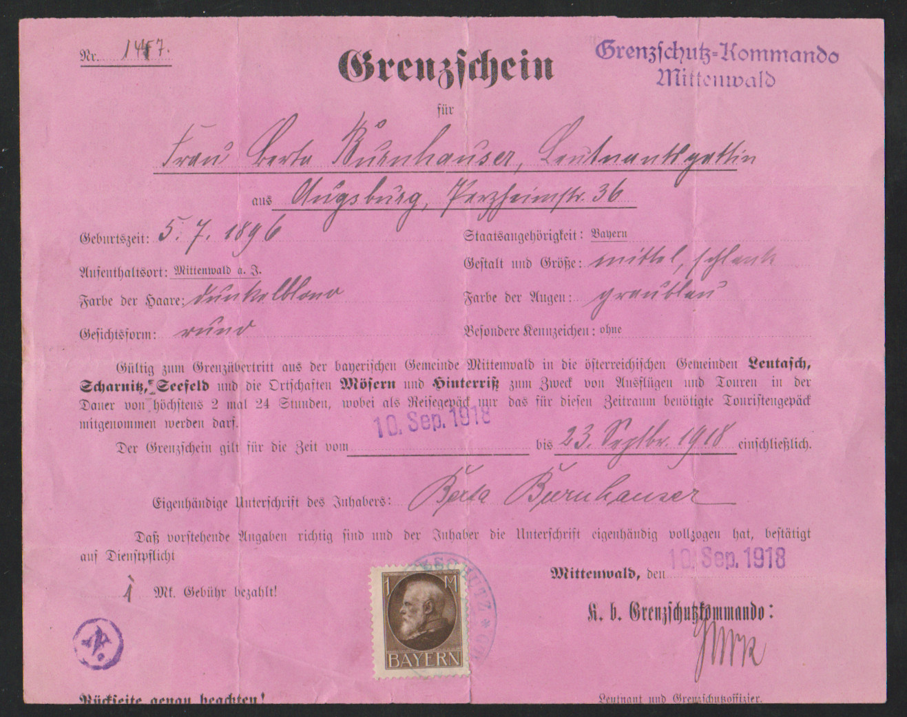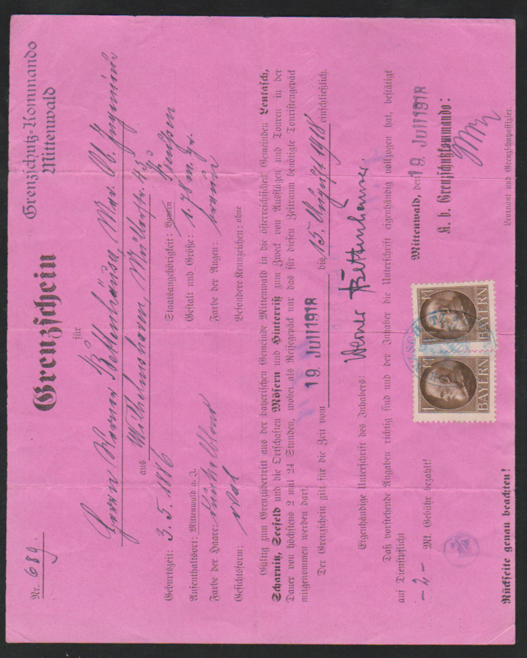 50 Pfg. Ludwig einzeln, sowie 1 Mk. einzeln bzw. per zwei (einmal Bugspur), als seltene Frankaturen auf drei rosa Grenzscheinen aus Mittenwald 1918