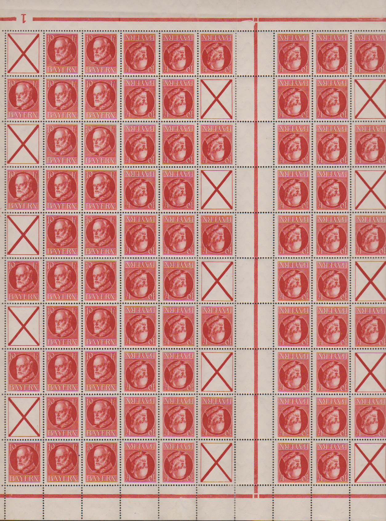10 Pfg. Ludwig, Markenheftchenbogen 7A postfrisch, übliche Vorfaltung und ein Leerfeld/Andreaskreuz, am Rand, mit Falz gestützt. Mi. 1000,-