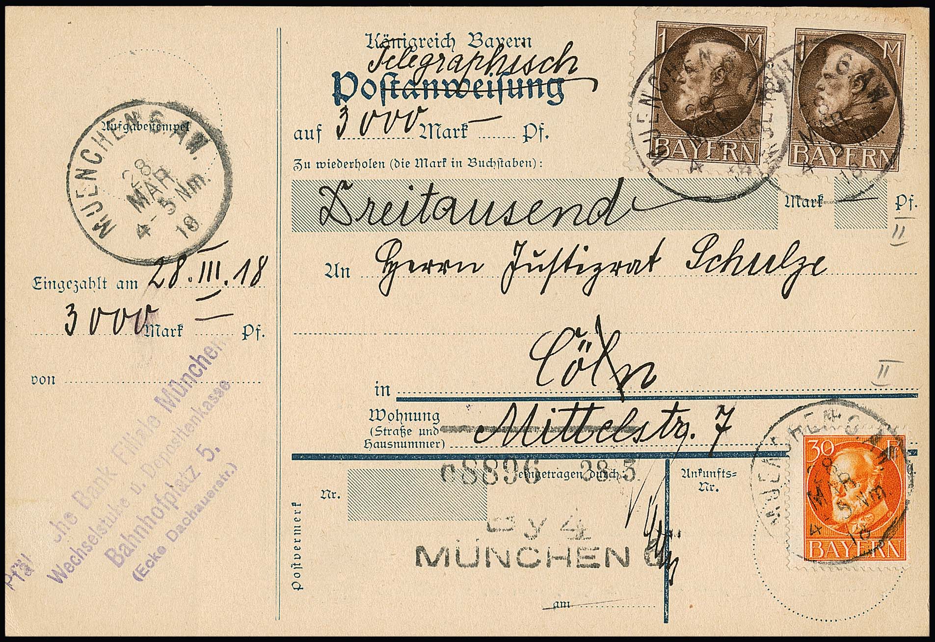 30 Pfg. und Paar 1 Mk. Ludwig auf seltener telegraphischer Postanweisung über 3000,- Mk. von München 1918 nach Coeln, sign. Infla