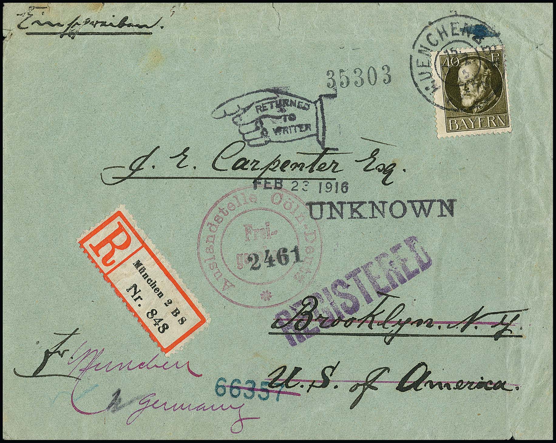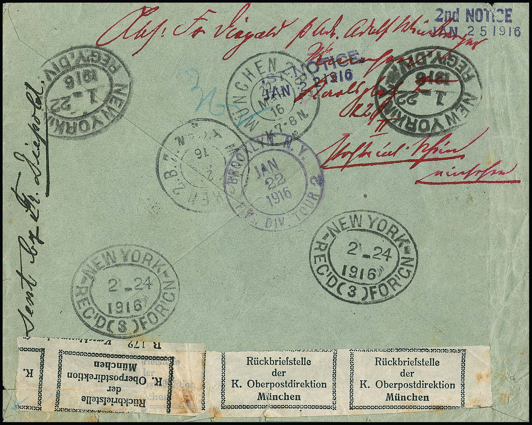 40 Pfg. Ludwig auf Retourbrief (übliche Gebrauchserhaltung) von München 1915 nach Brooklyn/USA 1916 und zurück, mit Zensur Cöln-Deutz sowie rs. Retourmarken der Rückbriefstelle der OPD München