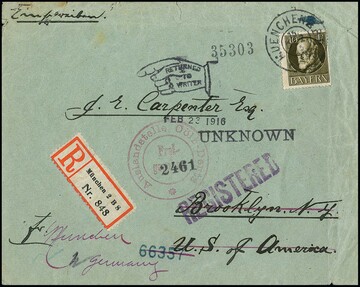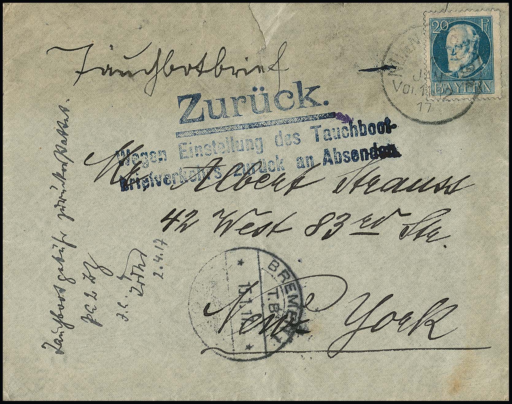 20 Pfg. Ludwig einzeln auf Retour-Tauchboot-Brief von München 1917 nach New York, L3 "Zurück. Wegen Einstellung des Tauchboot-Briefverkehrs ...", typische Gebrauchsmgl.