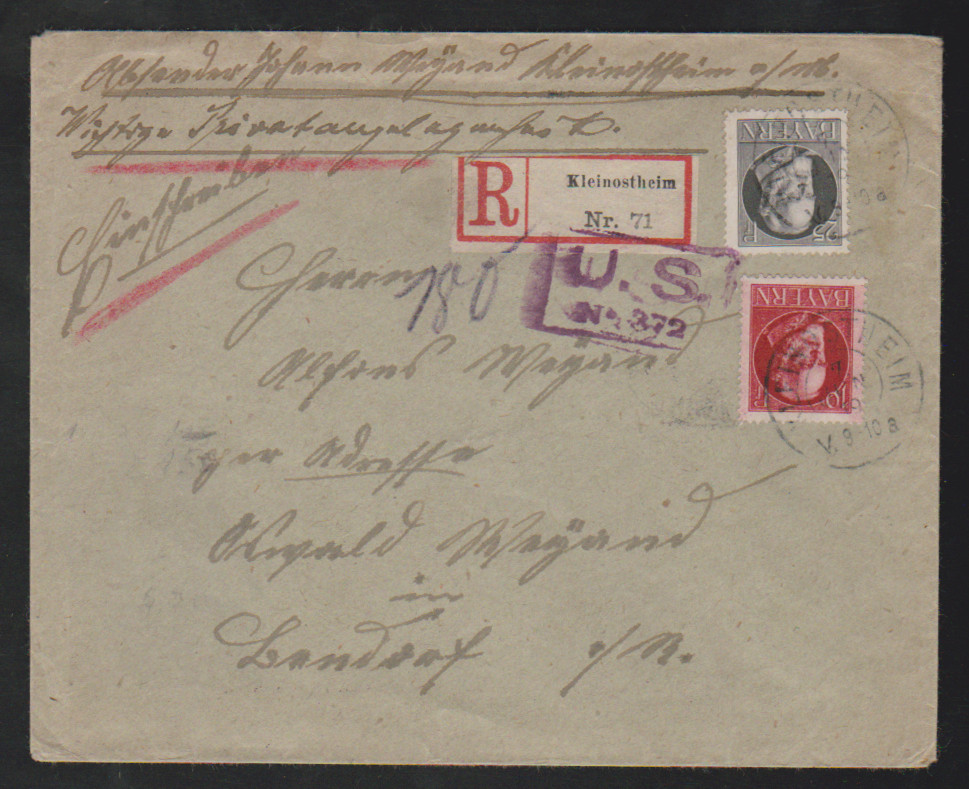 10 u. 20 Pfg. Ludwig auf Zensur-Brief von Kleinostheim 1919 nach Bendorf bei Cöln mit amerik. Zensur