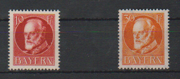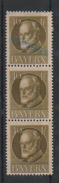 40 Pfg. Ludwig, senkrechter Dreierstreifen, obere Marke ungebraucht mit Annullierungsstrich, untere beiden postfrisch, mit Abart "geklebte Papierbahn" (Michel nicht gelistet)