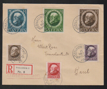 Ludwig Kriegsdruck, Markwerte (3 Mk. etwas fleckig) auf gelaufenem Sammler-R-Brief von Donauwörth 1920 nach Basel, Mi. lose über 200,-