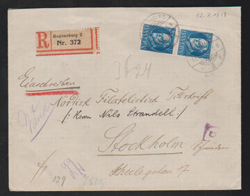 10 Pfg. Ludwig per vier, bzw. 20 Pfg. per zwei, auf zwei R-Briefen je von Nürnberg nach Schweden 1918 mit stummem Zensurstempel "a"