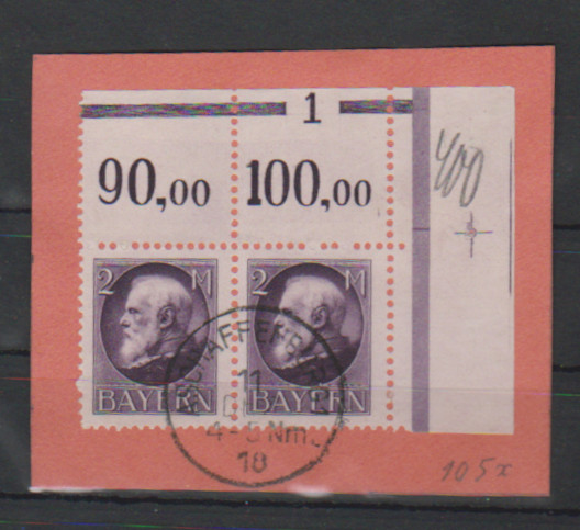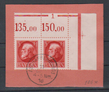 2 und 3 Mk. Ludwig Friedensdruck je im Eckrandpaar re. oben mit Platten-Nr. "1" und Passerkreuz auf Briefstücken