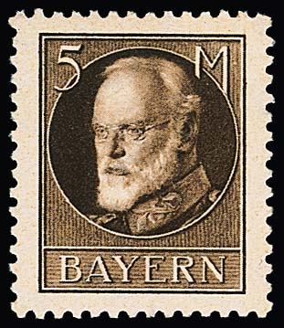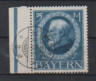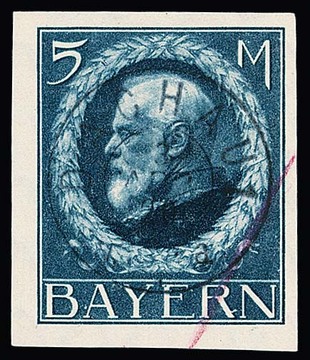 5 Mk. Ludwig, hellblau, spätere Auflage, ungezähnt aus Makulatur mit Gefälligkeitsstempel "Dachau" und Rötelstrich, Mi. 750,-