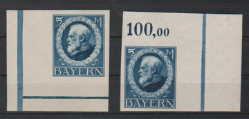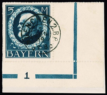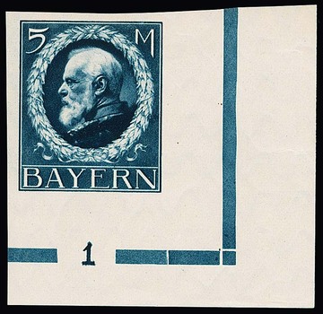 5 Mk. Ludwig Friedensdruck, große ungezähnte postfrische rechte untere Bogenecke mit Platten-Nr. "1", sign. Helbig