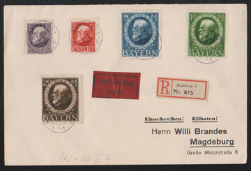 Ludwig-Markwerte Friedensdruck, 2 bis 20 Mk. kpl. auf Sammler-R-Brief von Bamberg an den bekannten Händler Brandes in Magdeburg (Mi. lose über 200,-)