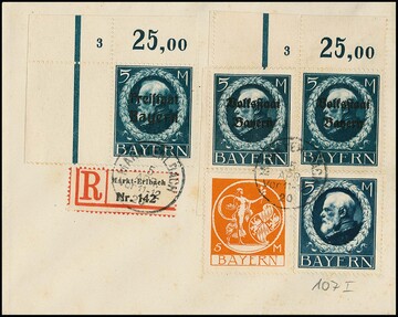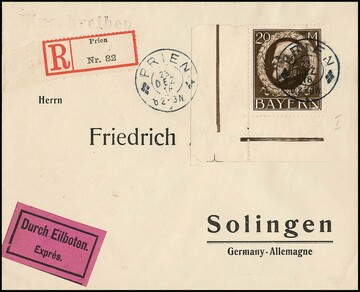 20 Mk. Ludwig, Friedensdruck, vollständige linke untere Bogenecke auf Expreß-R-Brief aus Prien, sing. Helbig