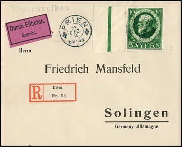 10 Mk. Ludwig Friedensdruck vom linken Bogenrand auf Expreß-R-Brief von Prien an Mansfeld/Solingen, sign. Helbig. Mi. lose 360,-