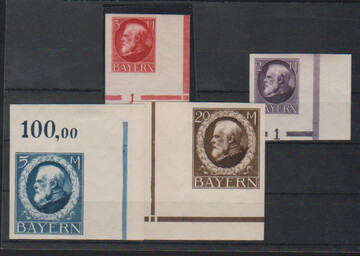 2, 3, 5 und 20 Mk. Ludwig Friedensdrucke ungezähnt je als tadellos ungebrauchte Bogenecken, 2 und 3 Mk. mit Pl.-Nr. "1", Mi. 260,- +