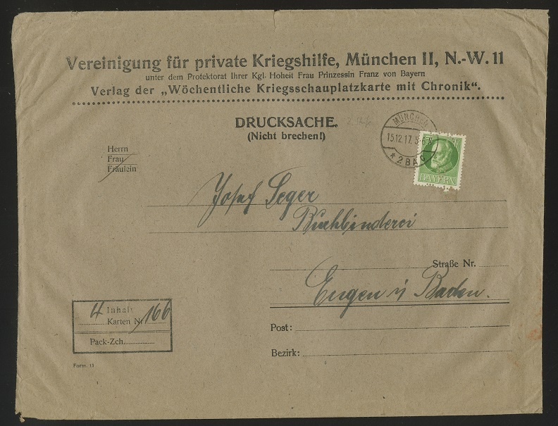5 Pfg. gelbgrün, Prachtstück auf großformatiger Drucksache der 2. Gewichtsstufe mit Vordruck der "Vereinigung für private Kriegshilfe", Marke mit Lochung "PKV"
