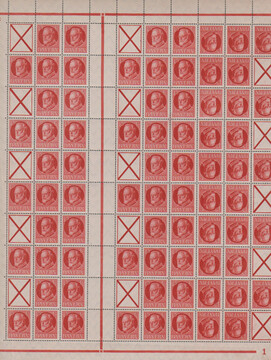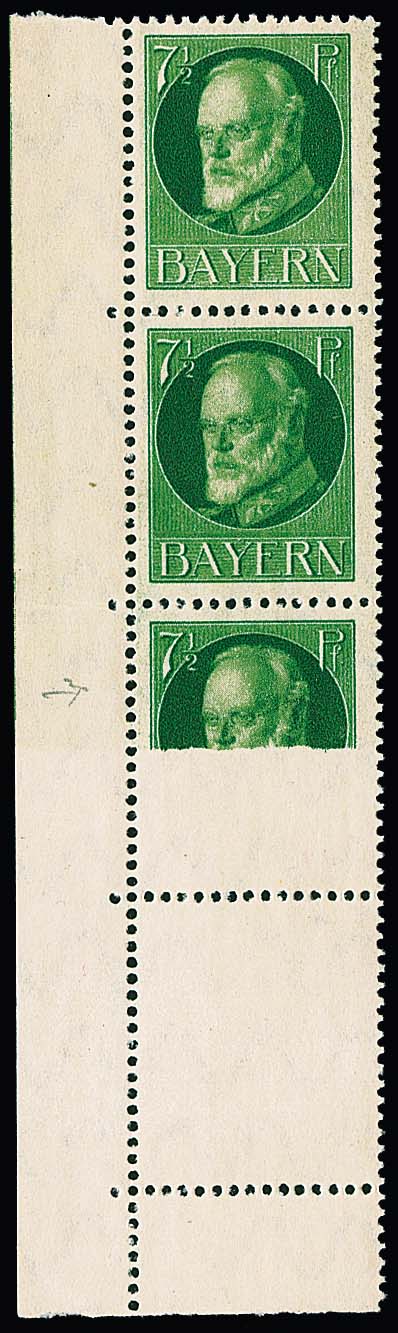 7 1/2 Pfg. Ludwig, senkrechter Rand-Viererstreifen, untere Marke Leerfeld, darüber die Marke nur zur Hälfte bedruckt durch geklebte Papierbahn (Michel nicht gelistet)