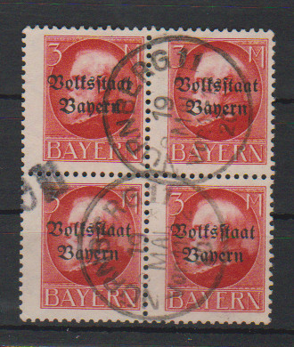 3 Mk. Volksstaat auf Frühdruck im gestempelten Viererblock, sign. Helbig. Mi. 140,-