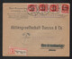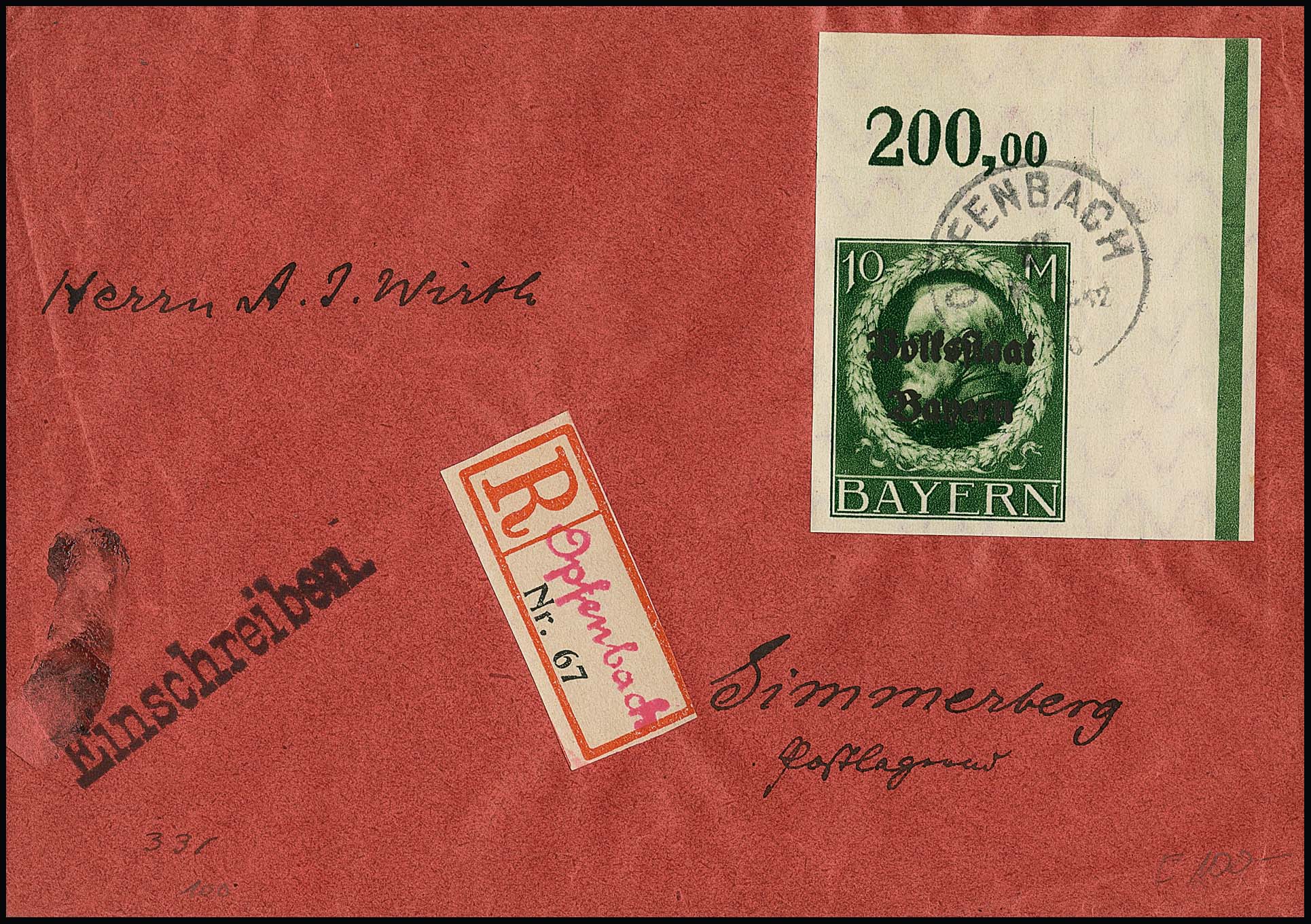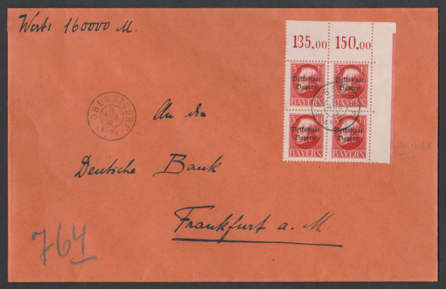 3 Mk. "Volksstaat" im Viererblock aus der rechten oberen Bogenecke (Walze Type 1A) auf Wertbrief aus Oberstorf