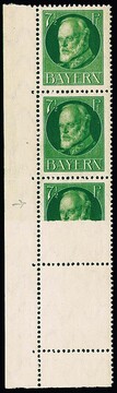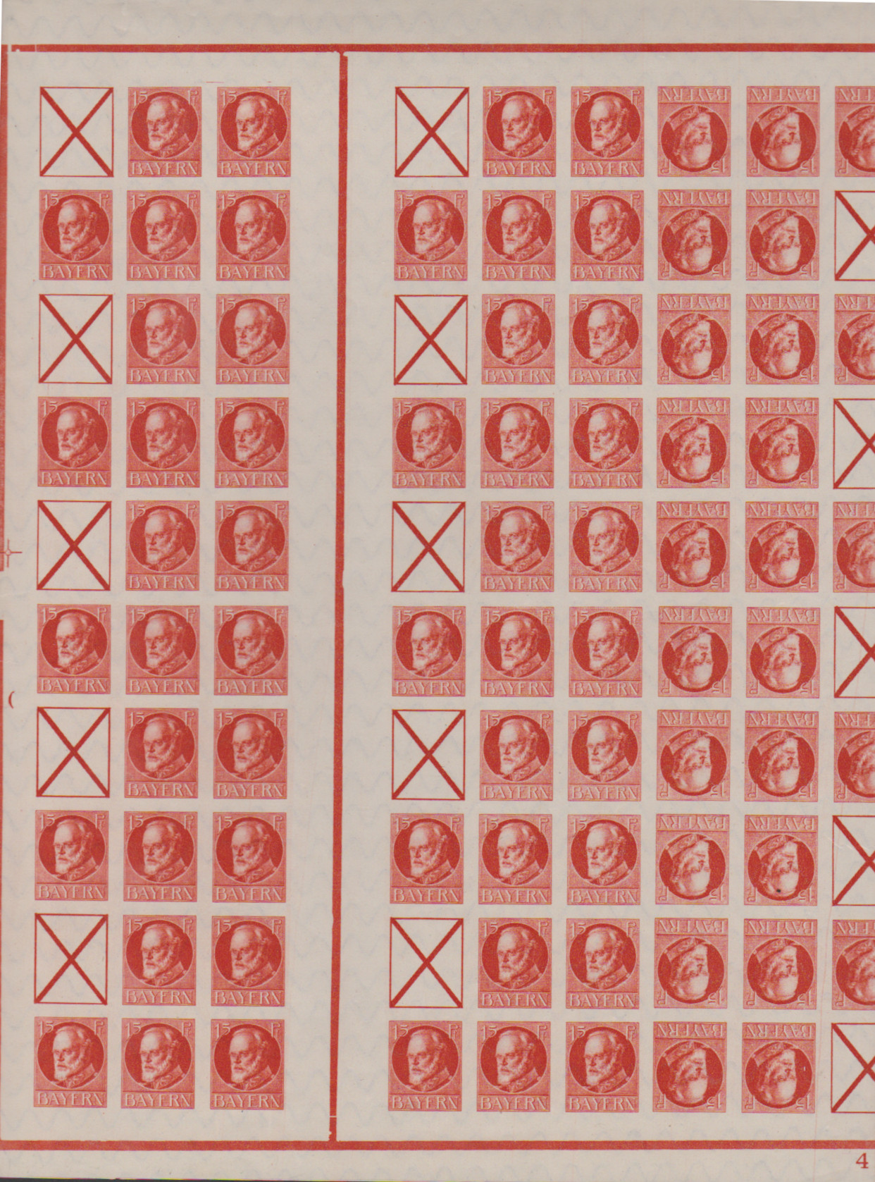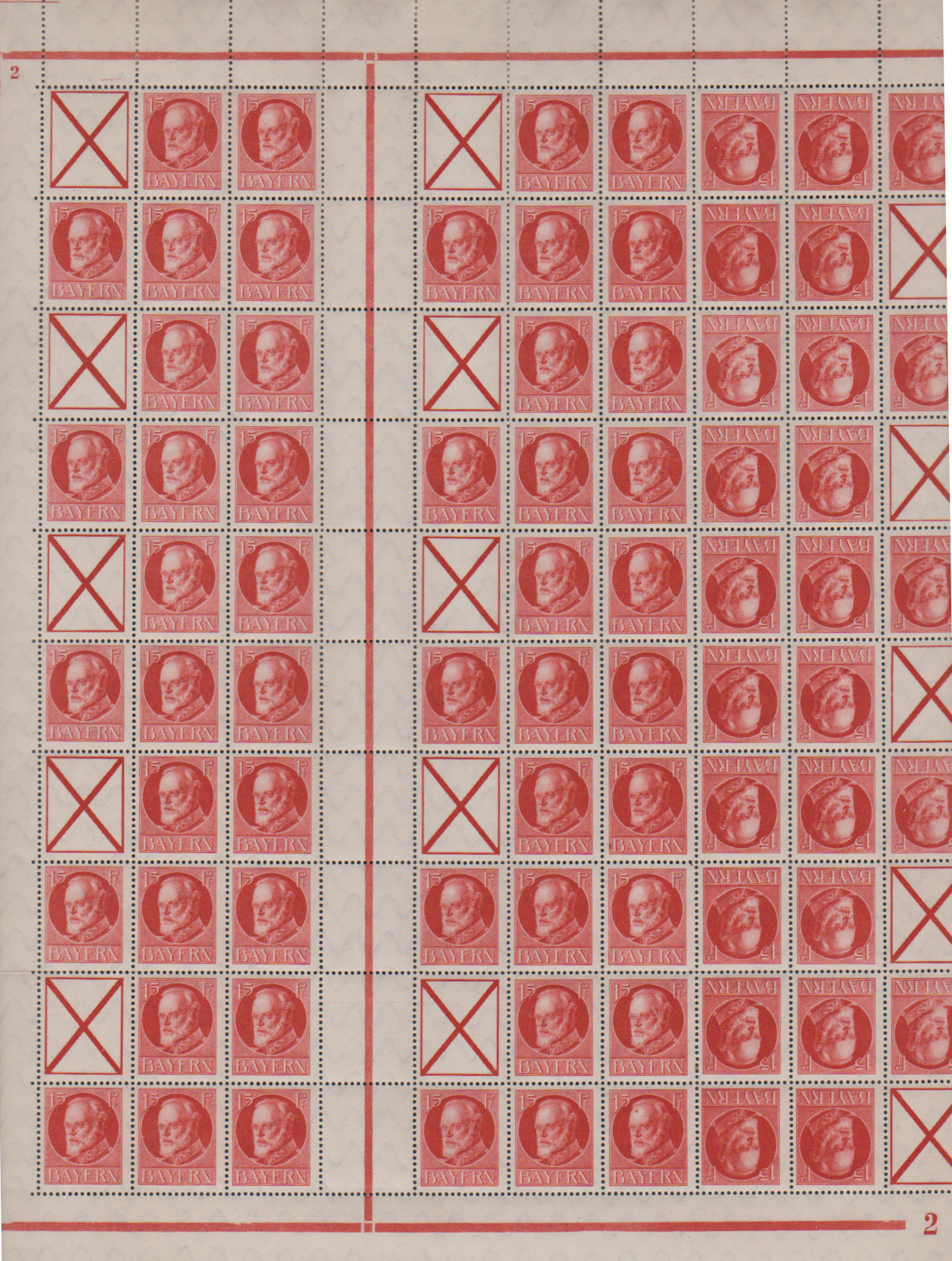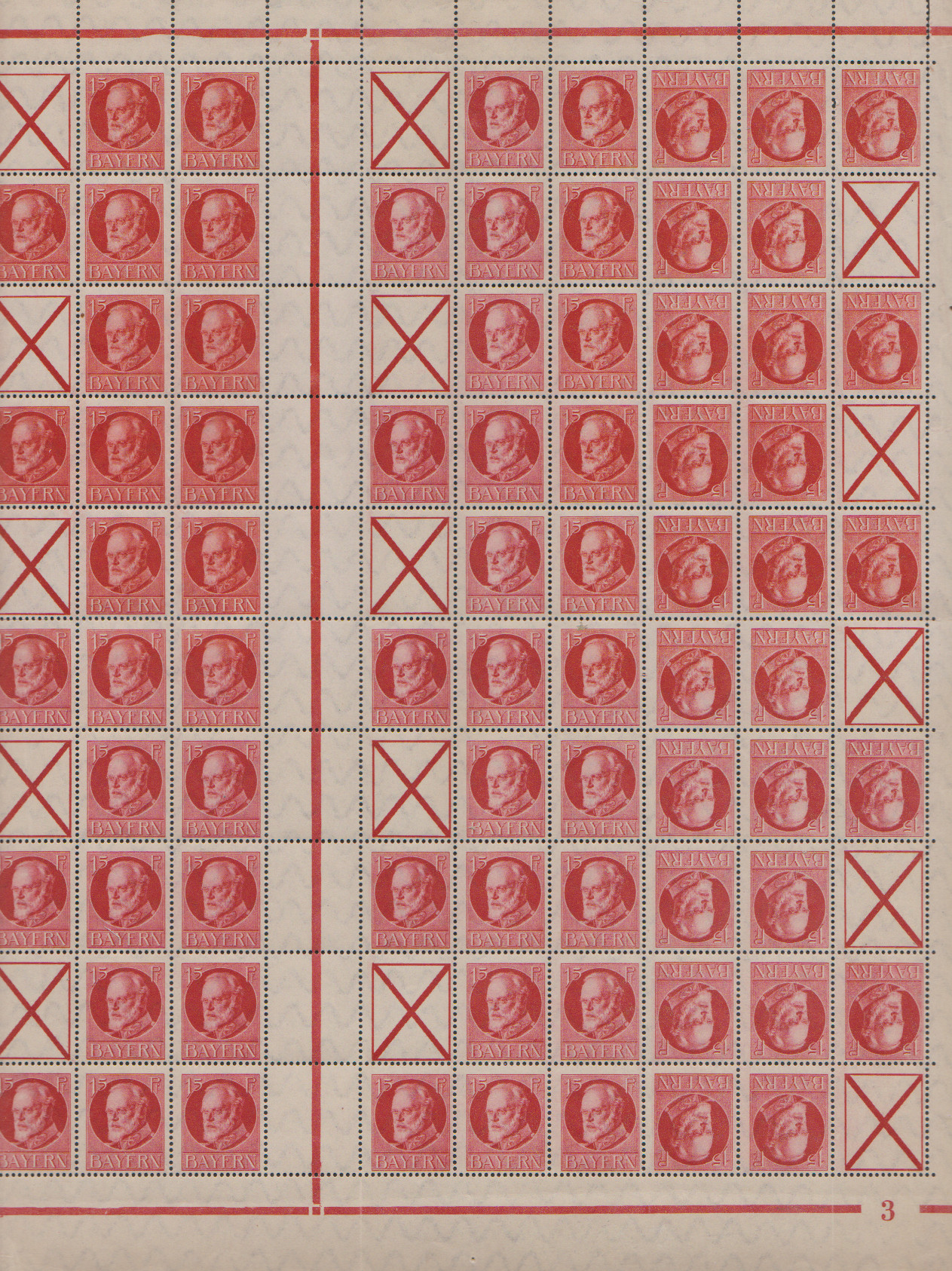 15 Pfg. Ludwig, Markenheftchenbogen 9A mit den verschiedenen Platten-Nr. "1", "2" und "3" (diese eine leichte und typische Vorfaltung in der Zähnung, die anderen ohne) je postfrisch. Mi. 1050,-
