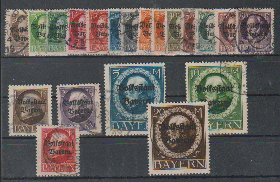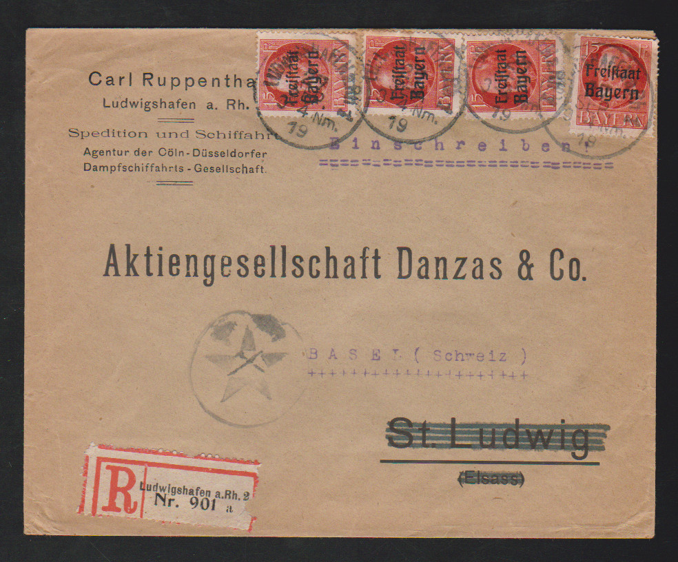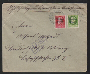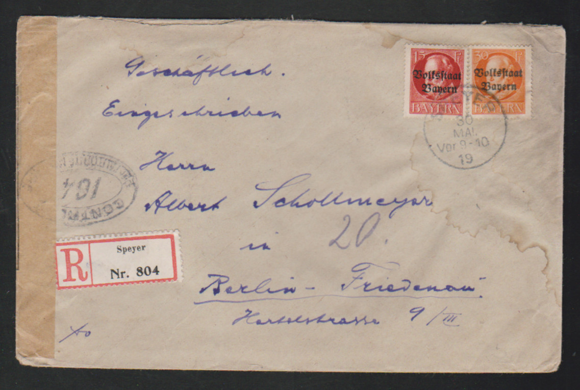 Ludwig-Aufdrucke, drei Zensurbriefe: 5 u. 10 Pfg. Volksstaat nach Coblenz mit US-Zensur, 15 u. 30 Pfg. Volksstaat auf R-Brief (Wasserspuren) von Speyer nach Berlin mit Eröffnung und französ. Zensur, sowie viermal 15 Pfg. Freistaat in die Schweiz mit französ. Zensur