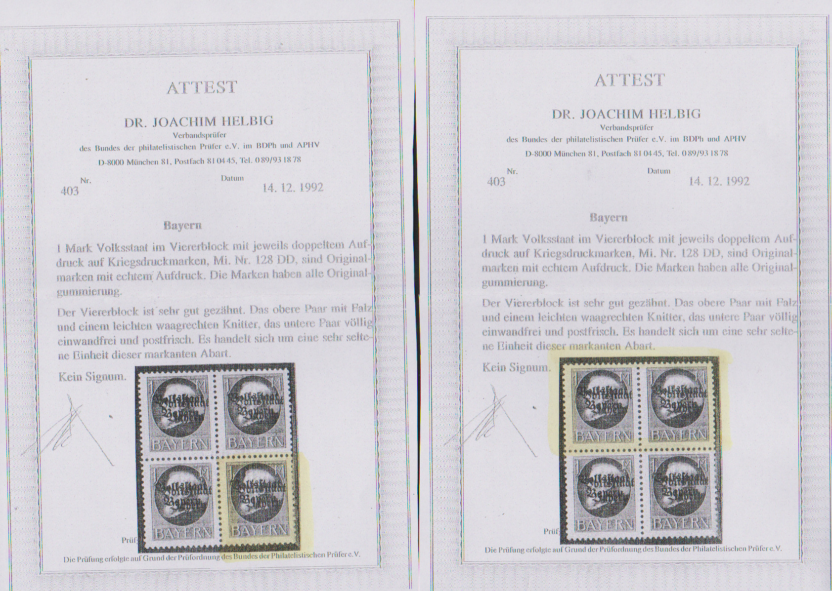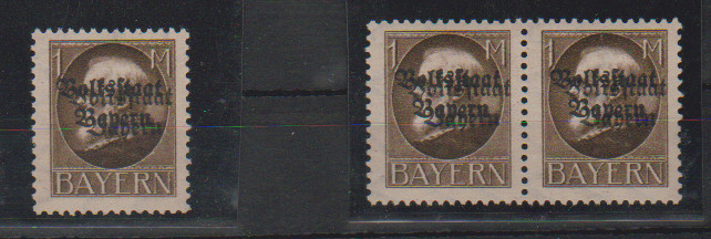 1 Mk. Volksstaat mit doppeltem Aufdruck einzeln postfrisch sowie im ungebrauchten Paar (dieses kl. Knitter), je Attestkopie Helbig. Mi. 260,-