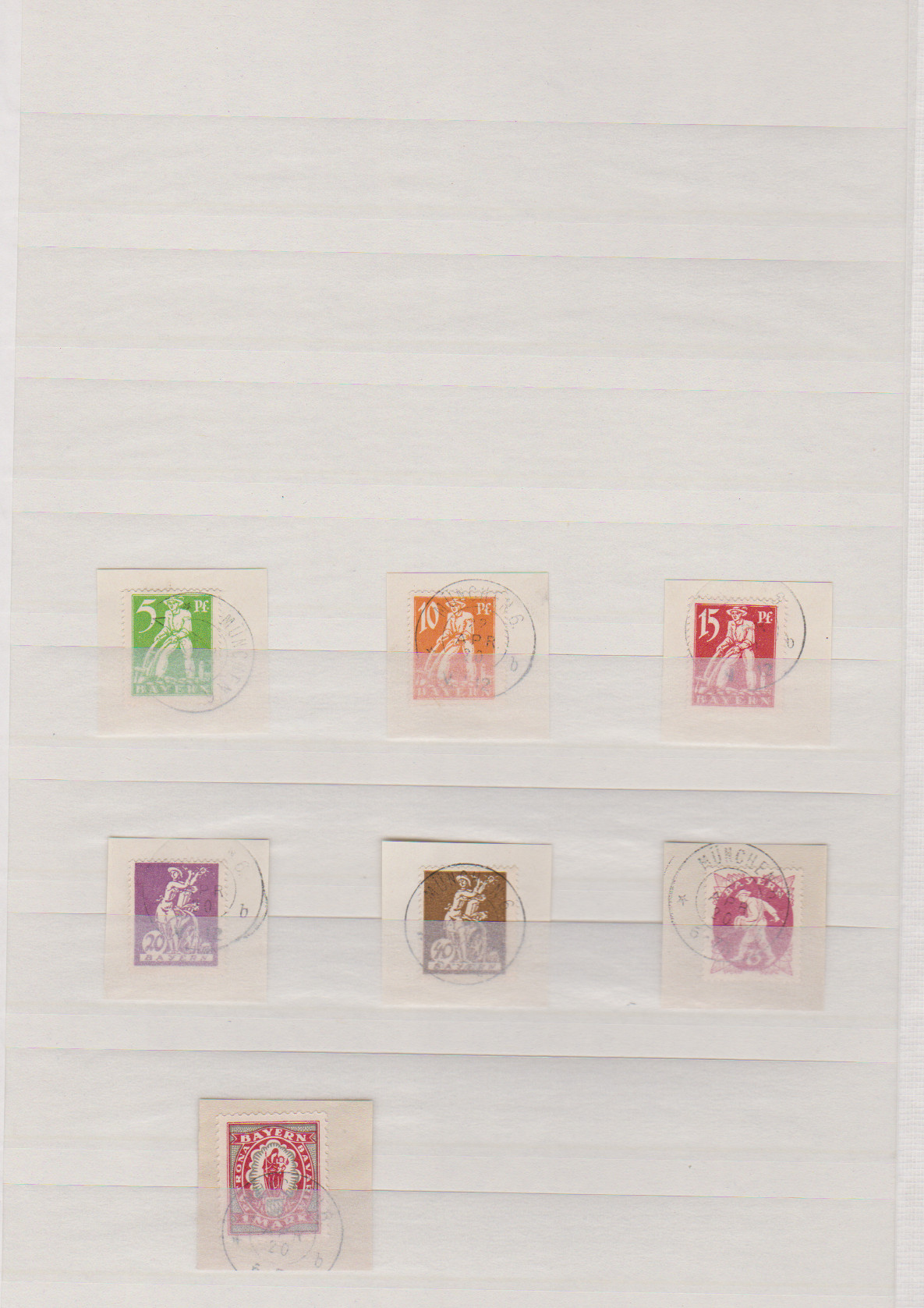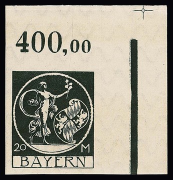 Bayern-Abschied, 10 Pfg. (Probe auf ungummiertem Kanzleipapier), 20 u. 60 Pfg. sowie 5, 10 und 20 Mk. je als geschnittene Bogenecken