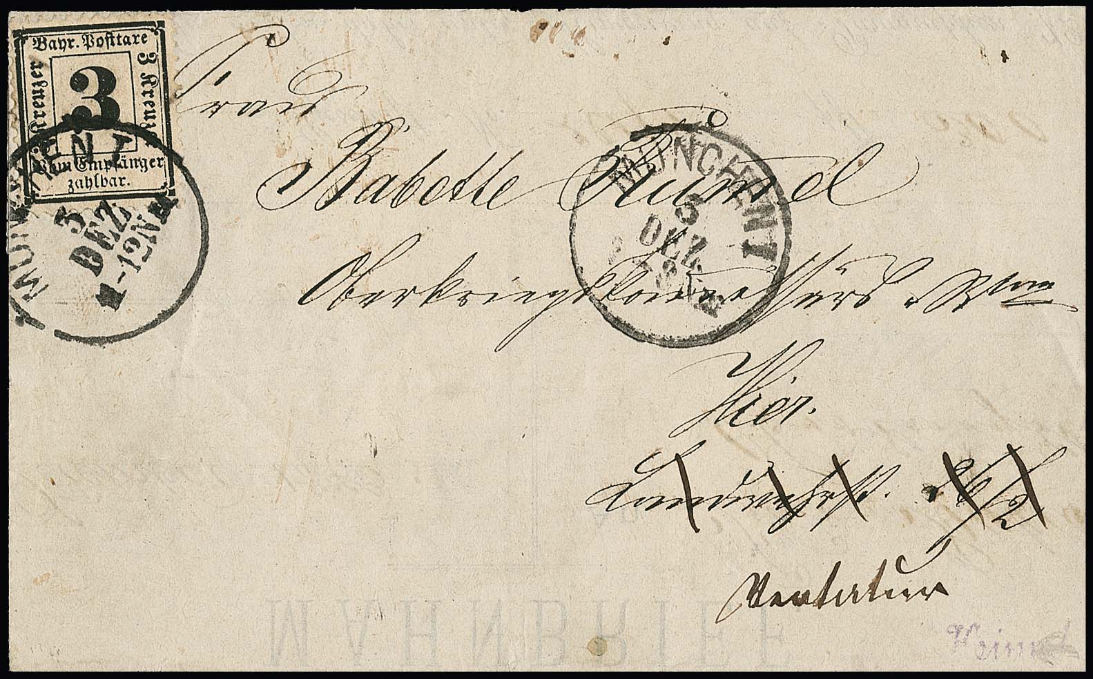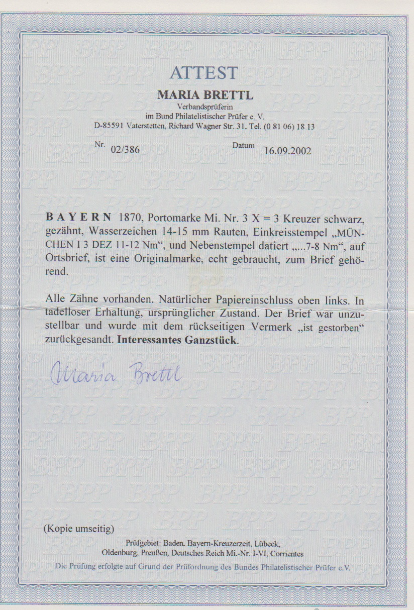 Portomarke 3 Kr. schwarz einzeln auf Kabinett-Retour-Ortsbrief aus München, hs. "ist gestorben", Attest Brettl. Mi. 1200,-