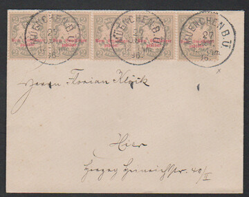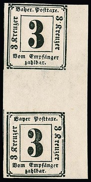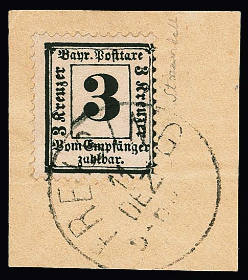 Portomarke 3 Kr. schwarz, oben berührt, auf Brief von Coburg (Inhalt) nach Würzburg, vermutlich mit der 1 Kr. NDP vorfrankiert, in den Zugbriefkasten geworfen, die NDP-Marke unentwertet und am Empfangsort in Würzburg mit der Portomarke nachfrankiert, Kuriosum. Sign. Pfenninger und Attest Brettl
