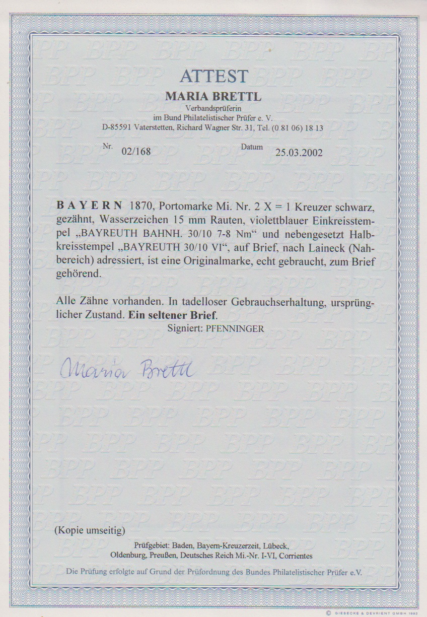 Portomarke 1 Kr. schwarz einzeln auf Prachtbrief mit K1 "Bayreuth" im Nahbereich nach Laineck. Sign. Pfenninger und Attest Brettl "in tadelloser Gebrauchserhaltung". Mi. 2000,-