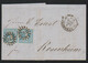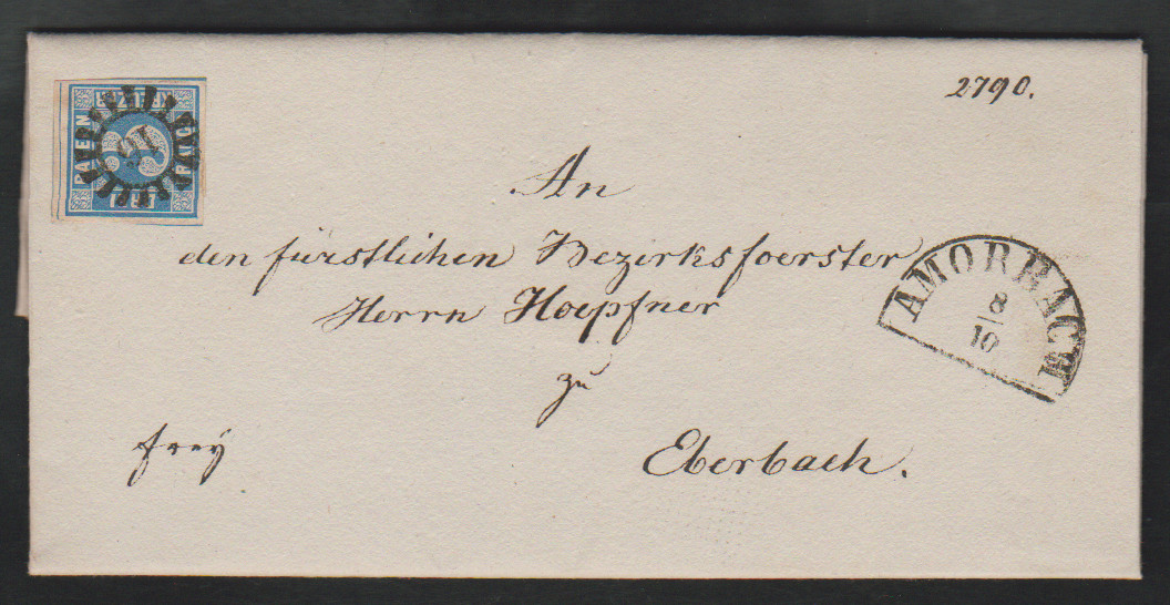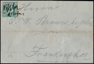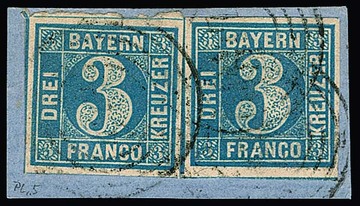 3 Kr. blau, breitrandiges Paar auf Prachtbriefstück mit seltener Fremdentwertung durch taxischen NS (wahrscheinlich "377" der Werra-Bahn), sign. Schwarz