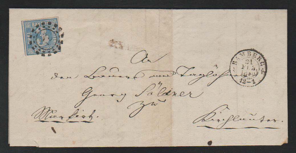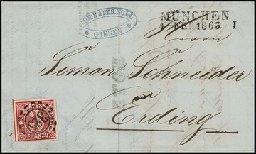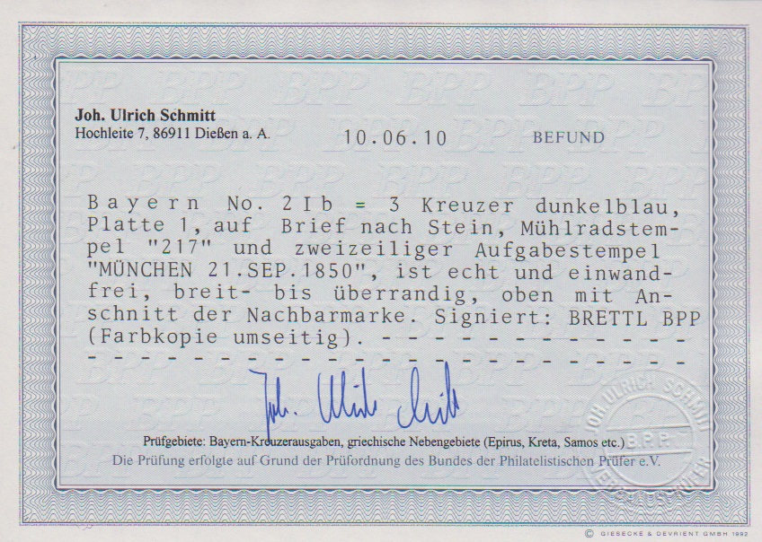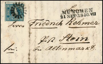 3 Kr. dunkelblau, Pl. I, auf Prachtbrief aus München 1850. Sign. Brettl und Fotoexp. Schmitt. Mi. 440,-