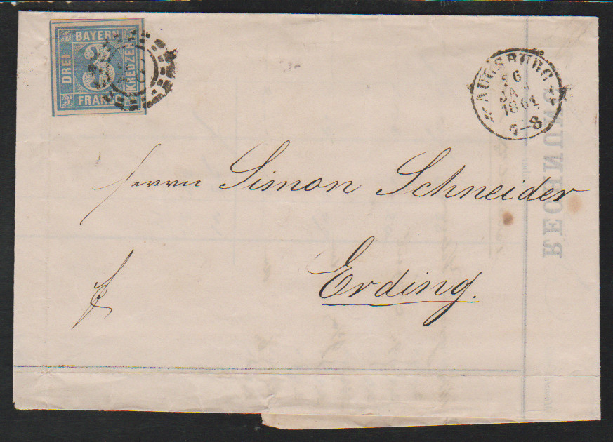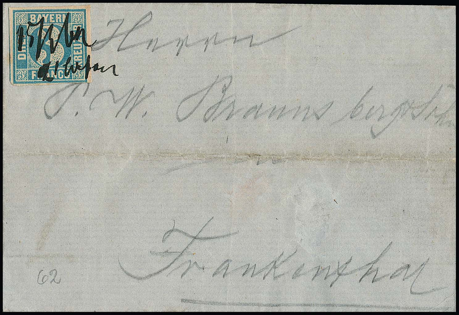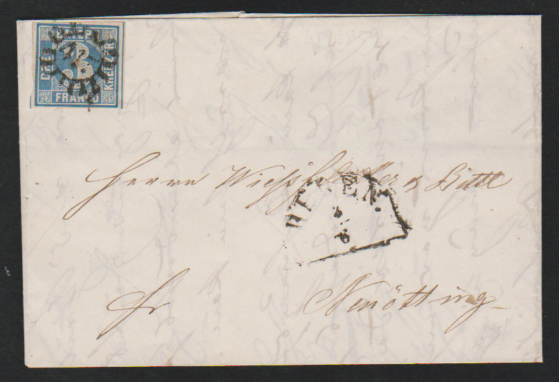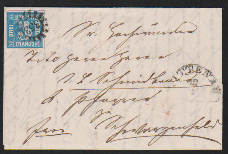 3 Kr. blau mit seltener hs. Entwertung "15 Mai L`Hafen" auf Brief (Mittelfalte) von Ludwigshafen nach Frankenthal (Beförderungsspuren)