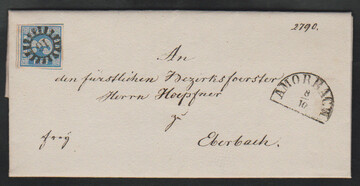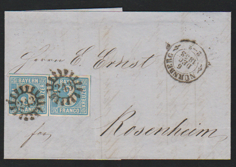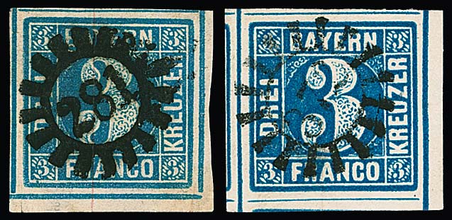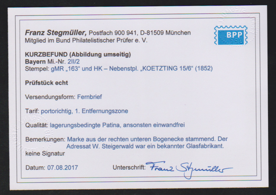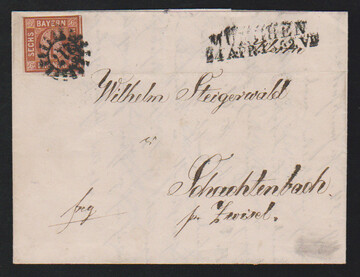 Zwei Briefe aus der bekannten "Steigerwald"-Korrespondenz nach Schachtenbach bei Zwiesel, einmal tadellose 3 Kr. blau mit besserem gMR "163" und HK "Koetzting" (Brief Lagerspuren), sowie etwas ber. 6 Kr. braun aus München, je 1852. Fotoexp. Stegmüller bzw. Schmitt