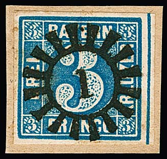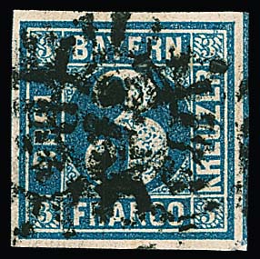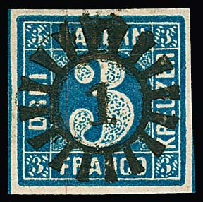 3 Kr. blau, breitrandiges Luxusstück mit ideal zentr. und "wie gedrucktem" gMR "1"