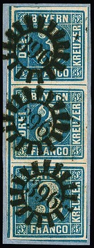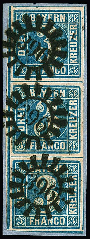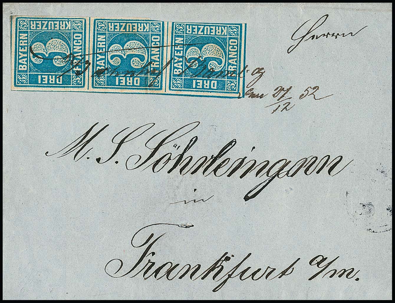 3 Kr. blau, senkrechter Dreierstreifen (re. ber.) auf Brief nach Frankfurt/M., aussergewöhnliche hs. Entwertung "Bahnhof Bamberg 21/12 52"