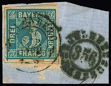 3 Kr. blau (fleckig) auf Briefstück mit kurios "vertauschter" Abstempelung, Marke mit K2 "Nürnberg" 1862 entwertet, der gMR "356" dagegen nebengesetzt