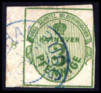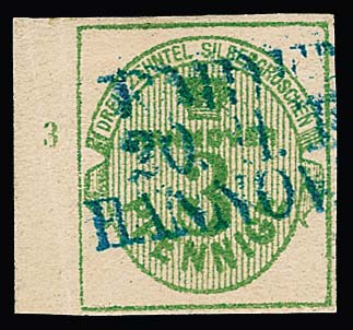 3 Pfge. grün, von dieser Marke seltenes linkes Randstück mit Reihenzahl "3", Bahnpost-L3 "Emden-Hannover", kleine helle Stelle und Bugspur im Bogenrand, sign. mit Attest Bühler. Mi. 1200,- +