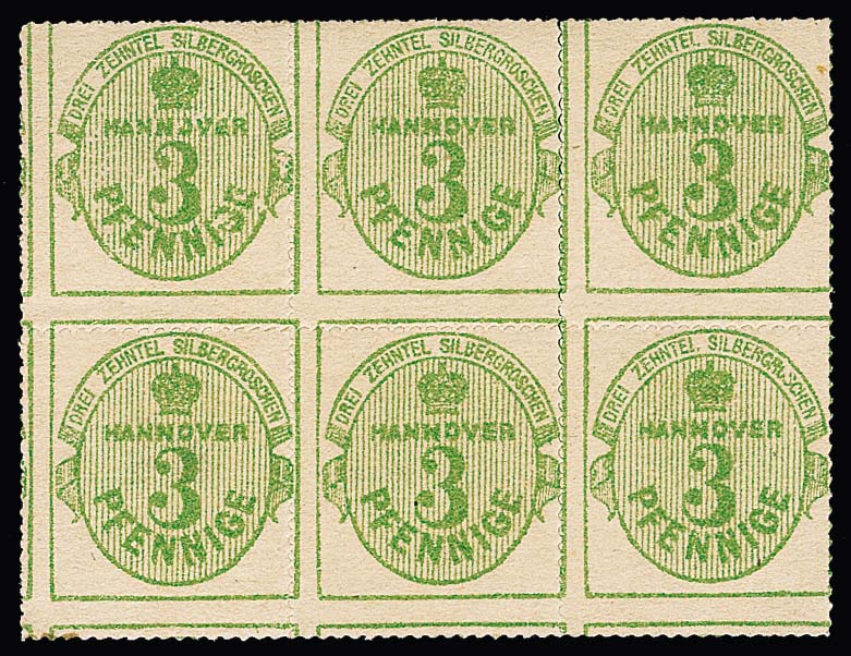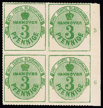 3 Pfge. grün, rosa Gummi, von dieser sonst meist dezentrierten Marken sehr gut zentrierter ungebrauchter Kabinett-Viererblock vom rechten Bogenrand, Reihenzahlen "5" und "6", drei (!) Marken postfrisch, Mi. für Falz 1000,- ++