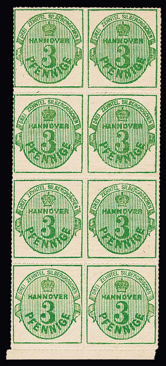 3 Pfg. grün, weißer Gummi, senkrechter Kabinett-Achterblock vom Unterrand, vier Marken postfrisch, sign. Bühler