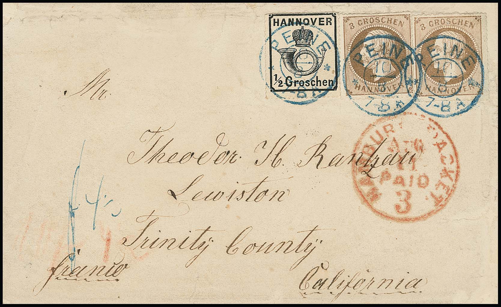 1/2 Gr. schwarz nebst zweimal 3 Gr. ockerbraun als 6 1/2-Gr.-Frankatur mit K2 "Peine" auf Brief 1866 via Hamburg nach Californien/USA mit Weiterfranko-Vermerk "4 1/2" (Umschlag gereinigt und rechte Marke sauber ausgebessert), Fotoattest Berger